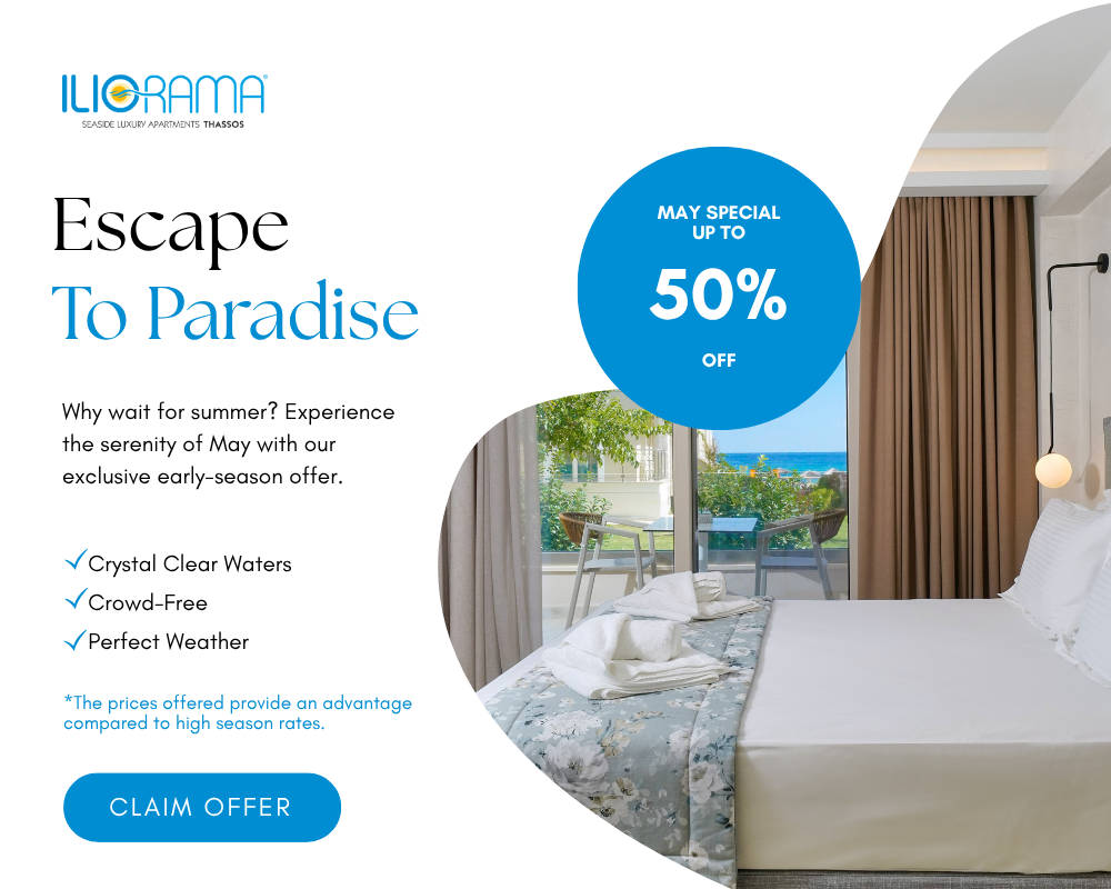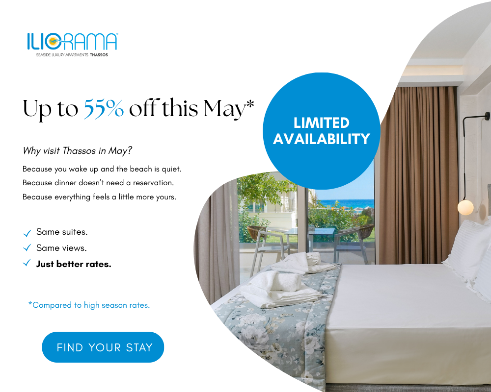 Perched on the sparkling shores of Thassos, Iliorama Luxury Suites & Apartments is your sanctuary for a refined and unforgettable getaway.
